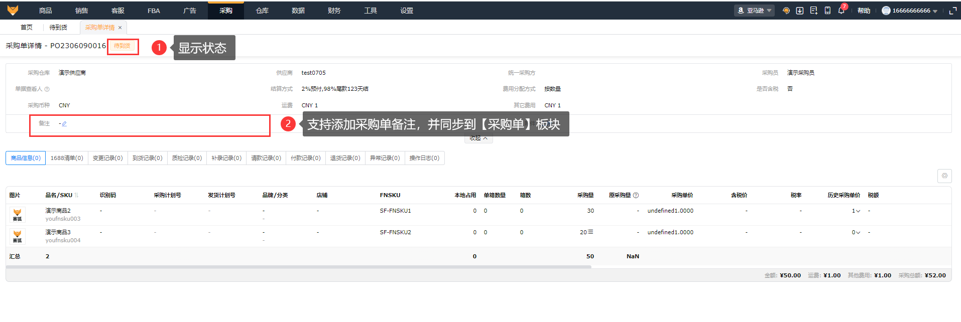 (2)支持添加/修改采购单备注,备注内容会实时同步到【采购】版块中;搜索栏中支持“备注”字段搜索对应采购单。