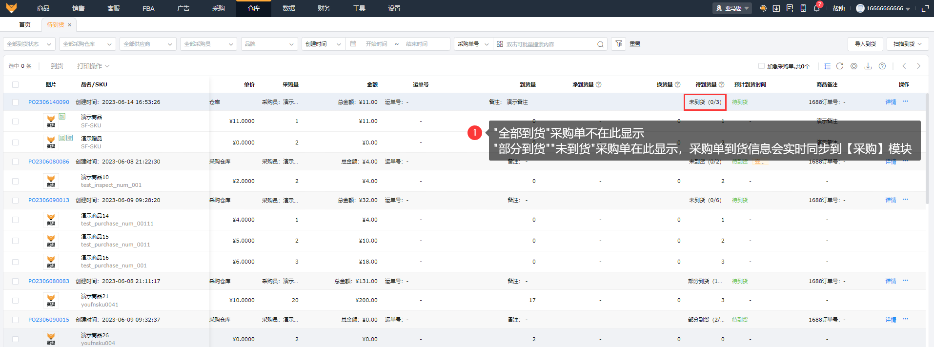 部分到货,该页面采购单不会消失,采购到货信息会实时同步到【采购】版块。