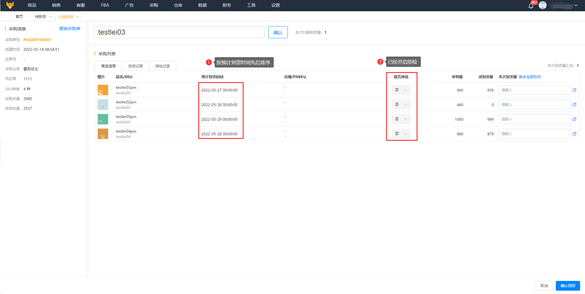 在【业务设置】开启质检流程后,“到货记录”和“质检记录”会显示良品量和次品量,反之则在“商品信息”显示良品量和次品量;采购单到货顺序按照预计到货时间先后排序。