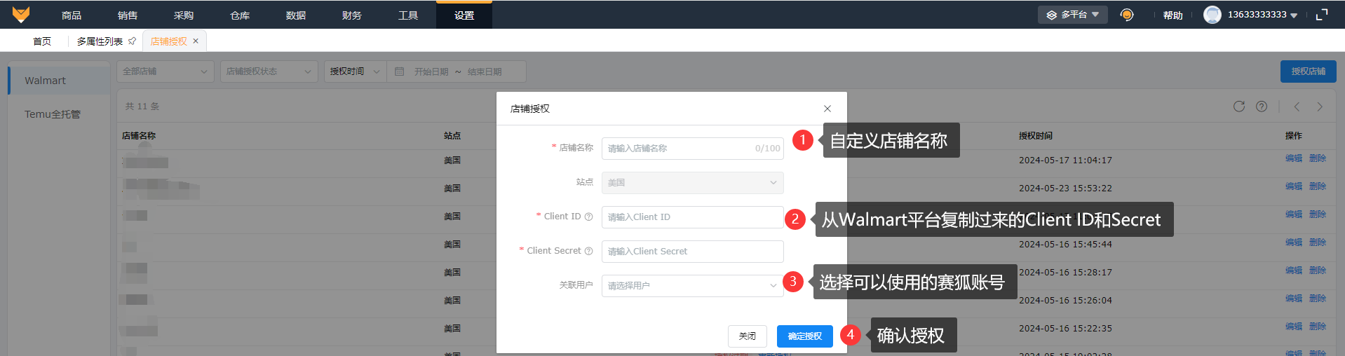 2、点击授权店铺,填写自定义店铺名称、美国站点需要填写Client ID和Client Secret,添加关联用户,确认信息无误后点击确认授权;