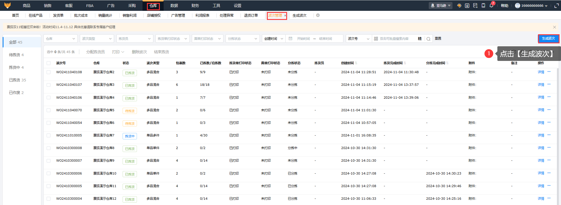 1.1、进入【仓库】-【波次管理】页面,点击【生成波次】