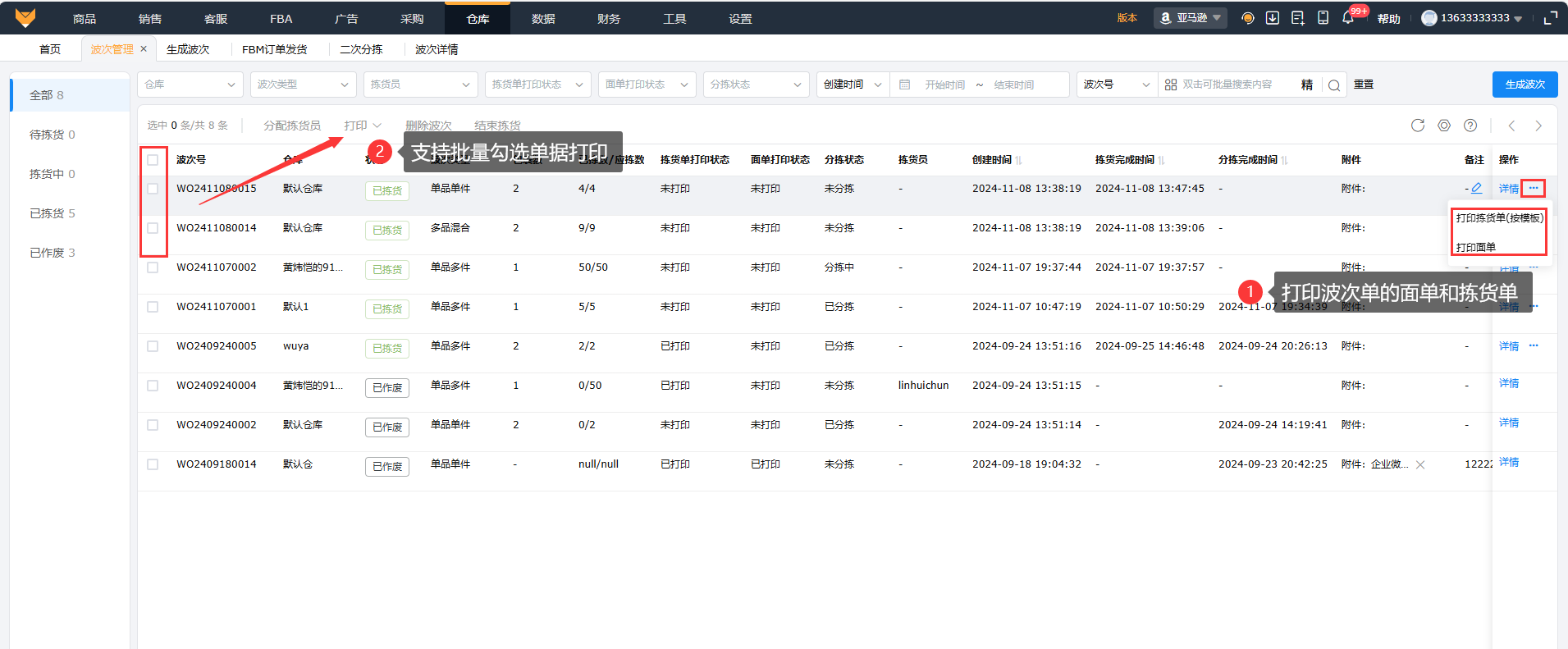 仓库代发货订单繁多,如何将特定渠道/店铺的紧急订单优先发货?大促期间,仓库一天发货超过千单,此时拣货效率如何提升?仓库一次拣货太多,如何更快按照包裹分货?波次管理可以筛选所有需要拣货发货的订单,帮您按照拣货规则的最短路径、最佳库位库存、物流渠道和出库优先级等等条件拆分成多个拣货单,并给拣货单分配拣货人员,协助您快速完成订单的拣货发货。二、操作说明