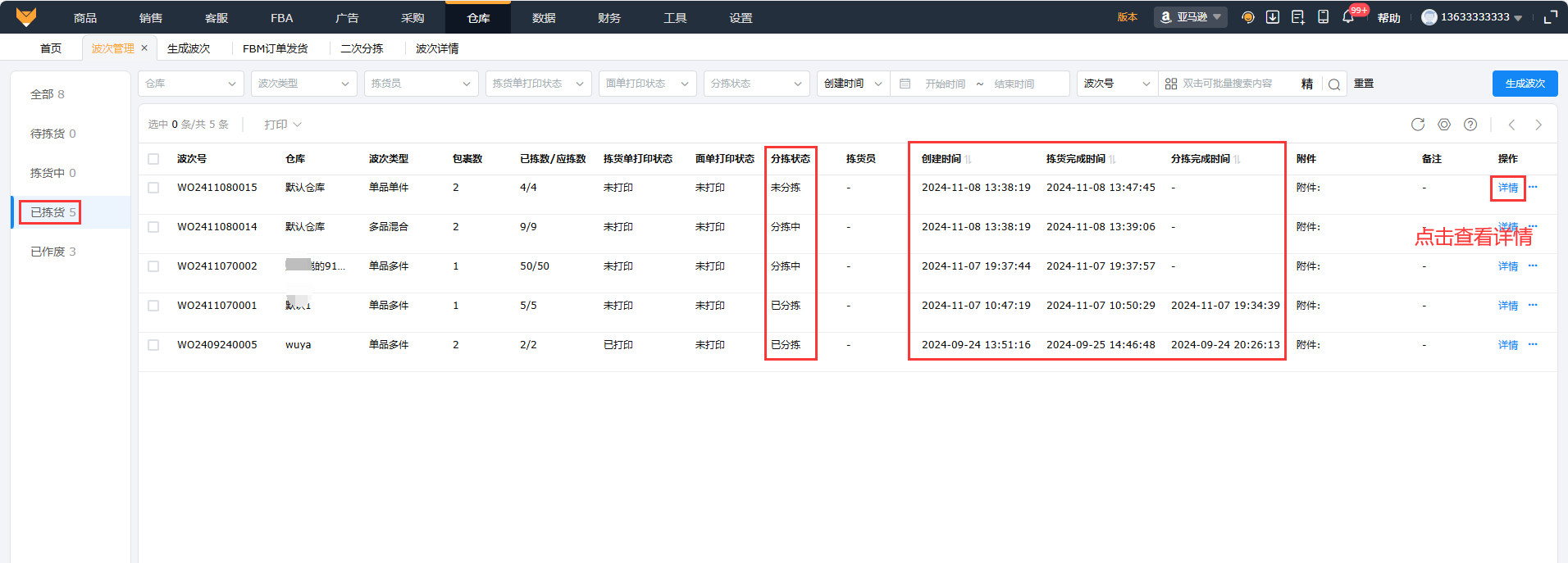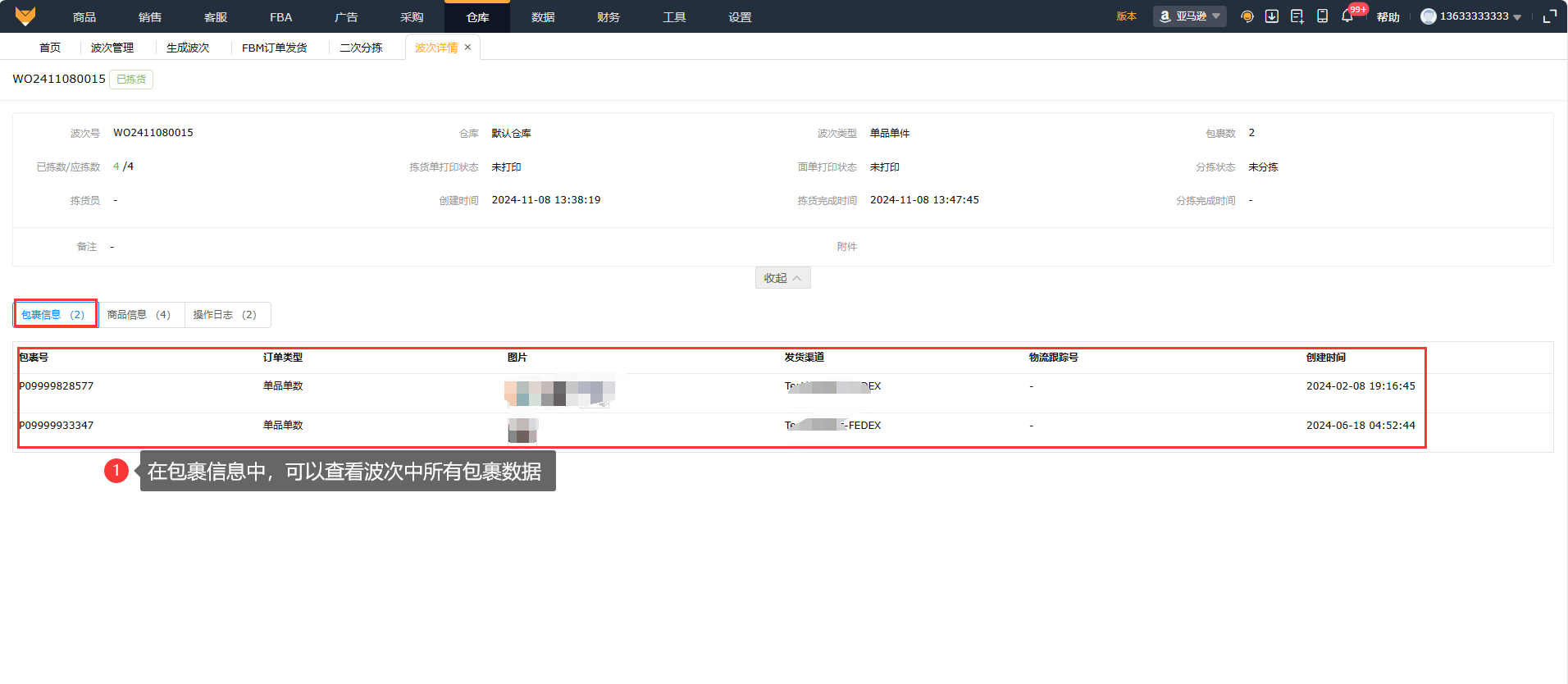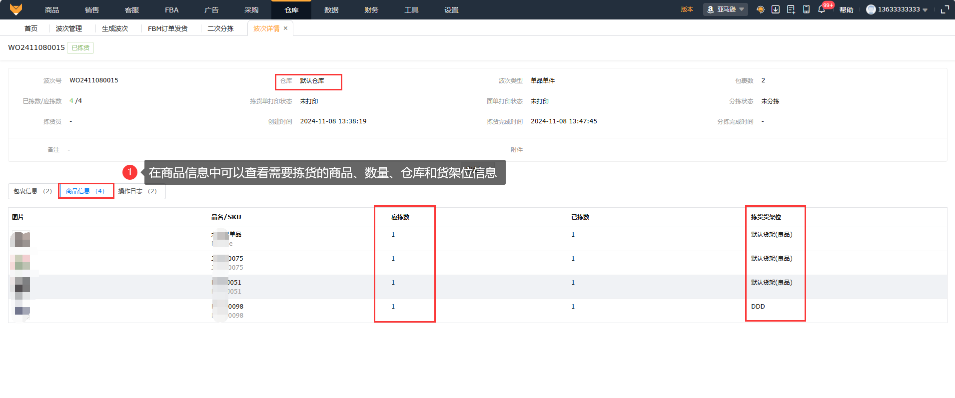待拣货的波次单操作“确认拣货”后,波次单更新状态为已拣货,在已拣货状态下可以查看波次单分拣状态、波次单创建、拣货完成和分拣完成时间;点击详情-包裹信息可以查看波次单中的所有包裹信息,在详情-商品信息中可以查看所有需要拣货的商品、数量、仓库和货架位信息,协助拣货人员拣货。
