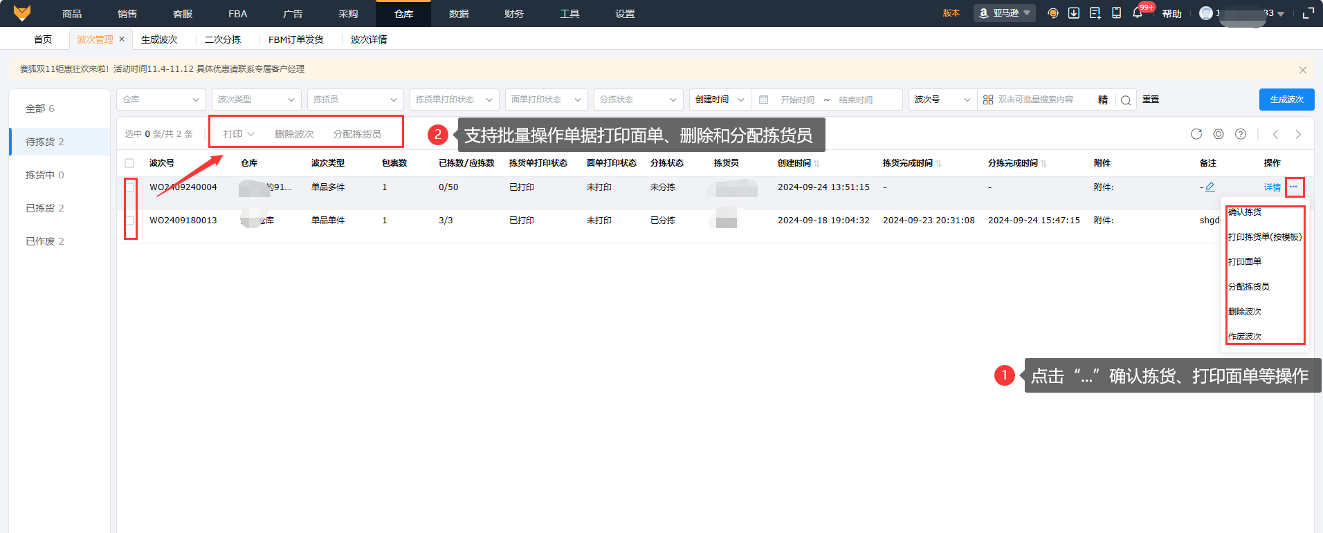 A2:这种是波次单在待拣货时,把波次单的拣货员设置给其他账号了,可以让波次单对应的拣货员操作二次分拣。