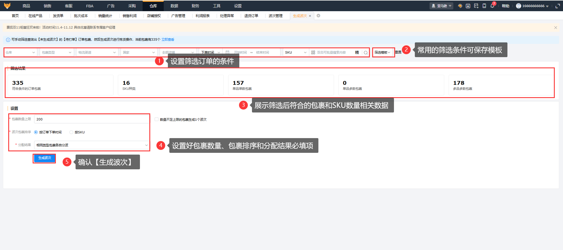 设置好筛选条件后,筛选结果中会展示符合条件的订单包裹、SKU种类以及不同类型的包裹数量;根据筛选结果中的数据,可以设置好包裹数量上限、波次包裹排序和分配结果;最后点击生成波次,处理波次单进行拣货发货。