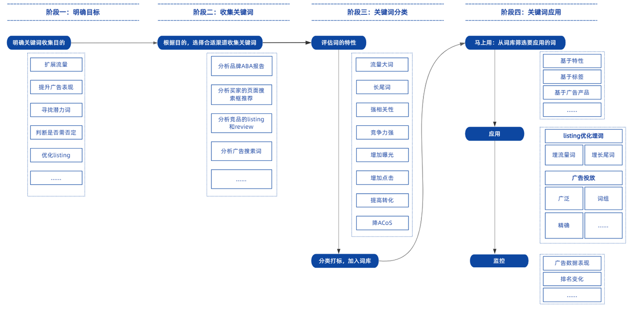 1.通过上面的流程图可以发现,赛狐关键词库搭建SOP共分为四大核心阶段: