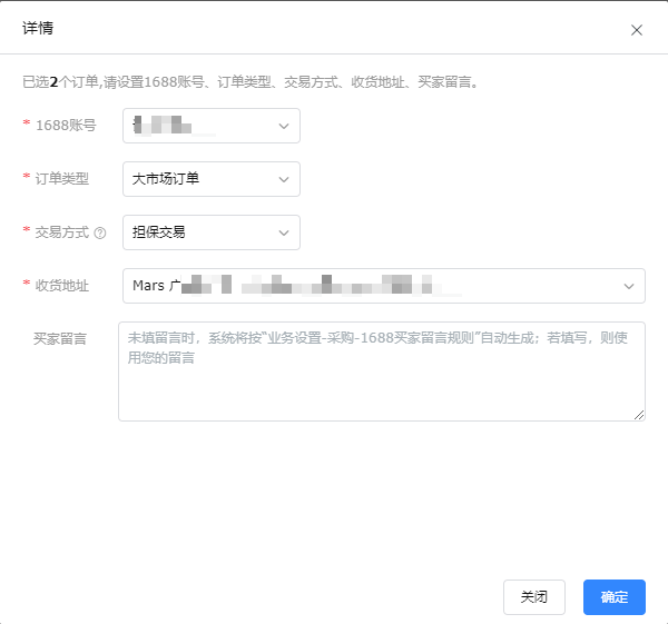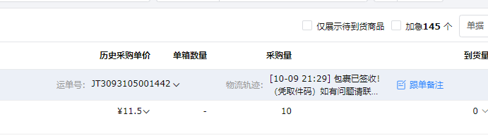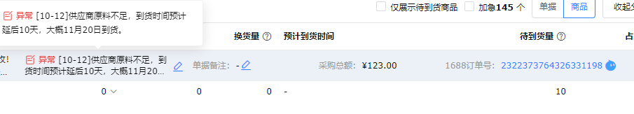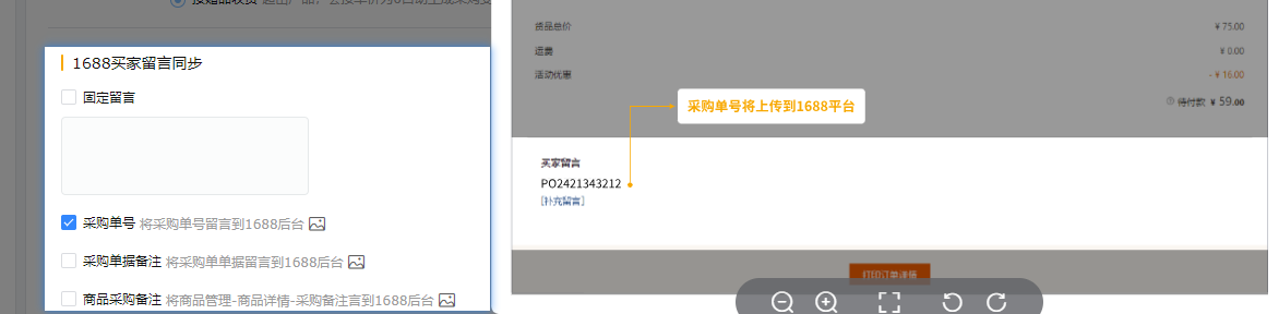 b 单据收货:支持将采购单备注同步到1688订单的买家留言中,仓库在收到货物时,可根据留言中的采购单信息快速找到对应单据进行到货处理。