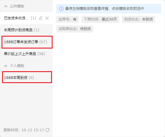 a 订单筛选:特定条件筛选单据,避免跟进大量订单,从而节省时间。举例:如图所示,目前有67个未发货的1688订单需要跟进,跟单人员可以集中精力处理这些订单。