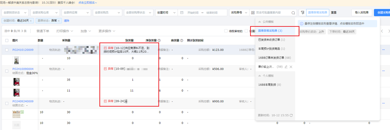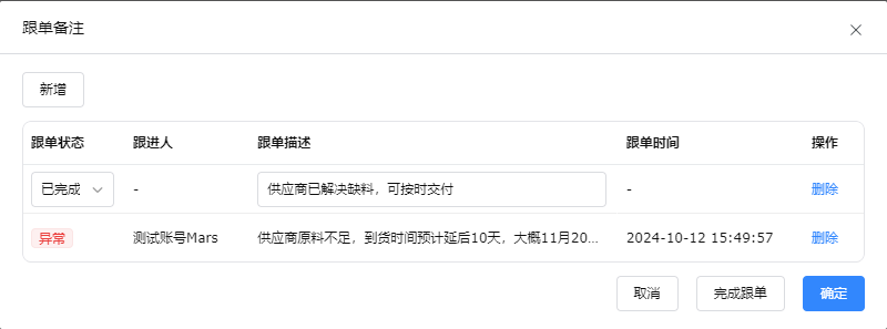 c 跟单备注:在采购单上添加跟单备注并按状态筛选,从而快速定位和处理异常标记的单据。