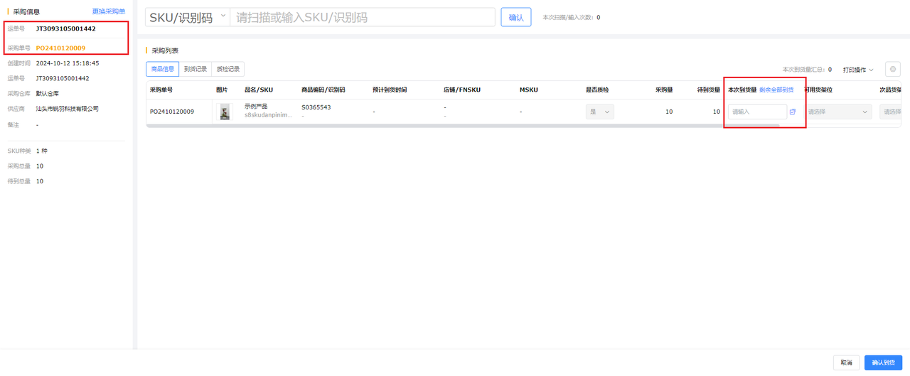 a 扫描到货:赛狐支持通过扫描快递单号找到对应采购单,并进行到货操作,快速匹配线下货物与线上单据,实现高效入库。