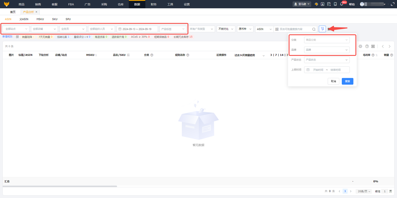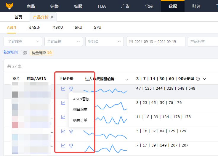 - 产品分析提供了销售数据、表现数据、排名数据、库存数据、广告数据,退货数据、利润数据、售后数据等;