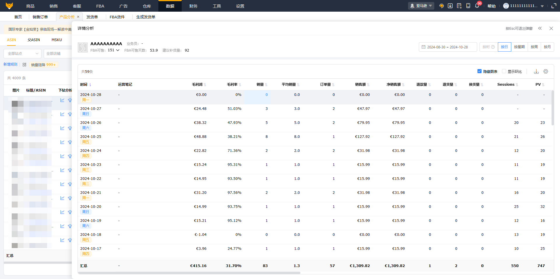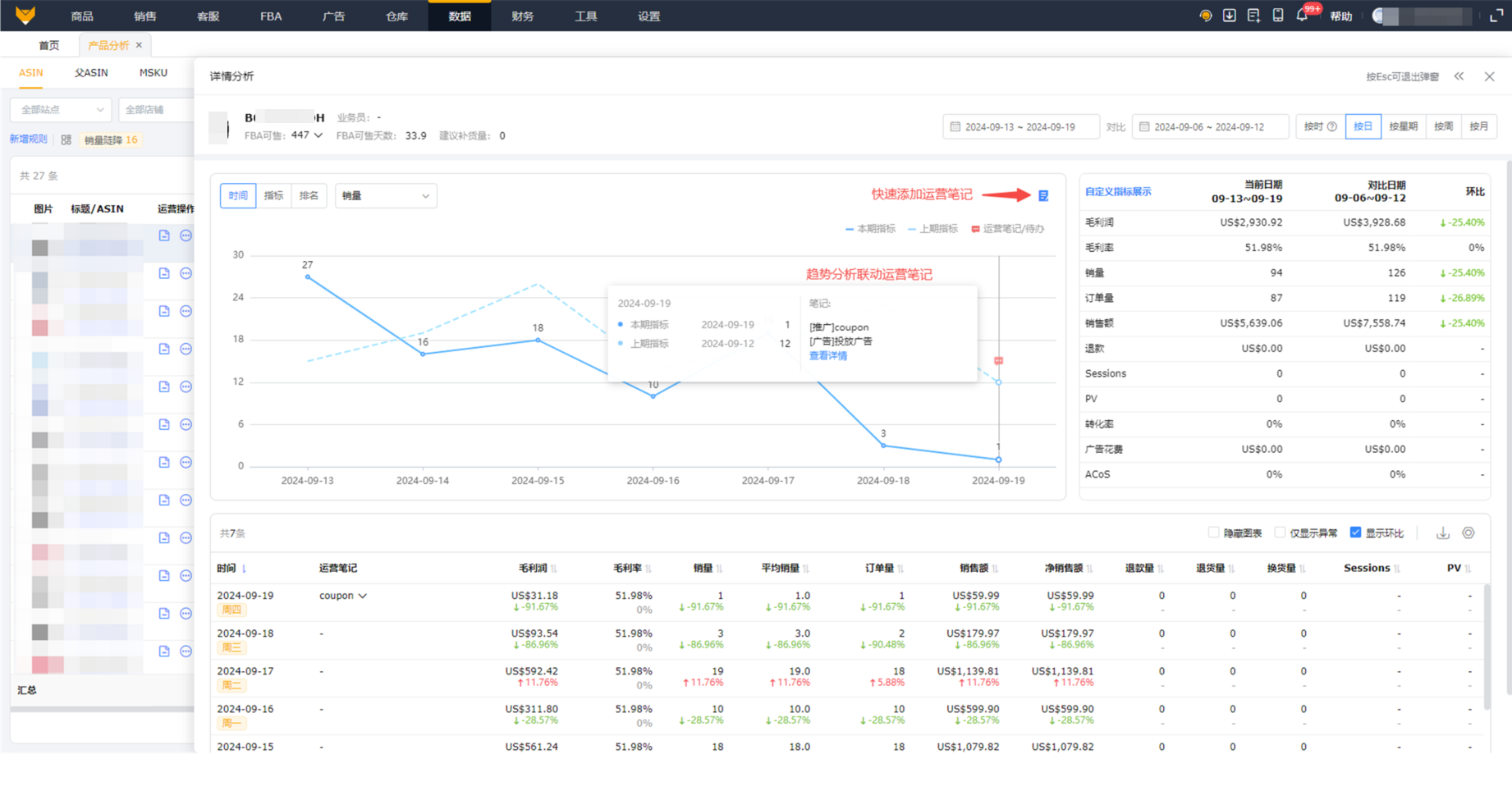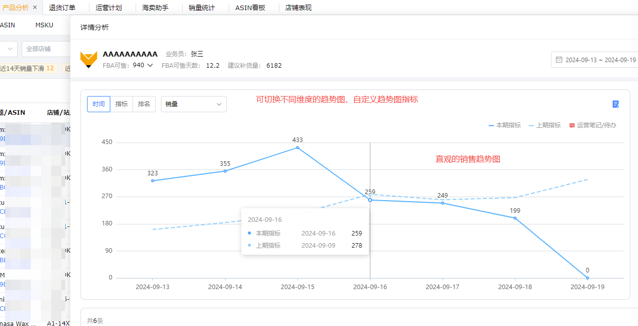 - 深入分析单个商品的所有数据:各个指标及同期对比、销售明细、广告表现、库存、流量等数据指标;