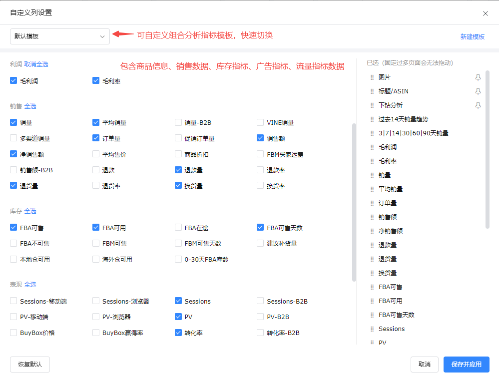 - 支持设置展示指标组合分析模板,快速切换模板;