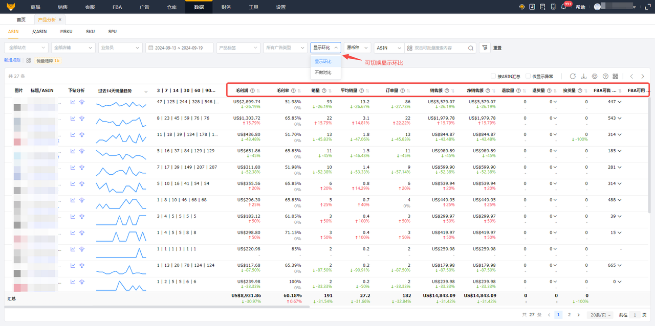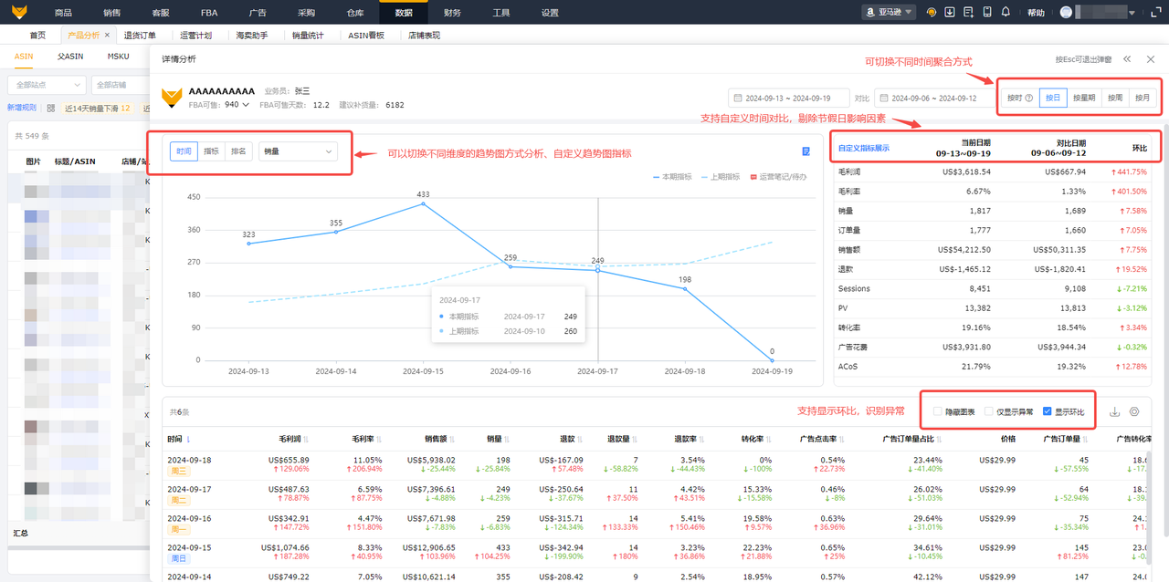 - 同时支持环比数据统计和对比分析,帮助卖家发现销售异常,为指定策略提供参考;