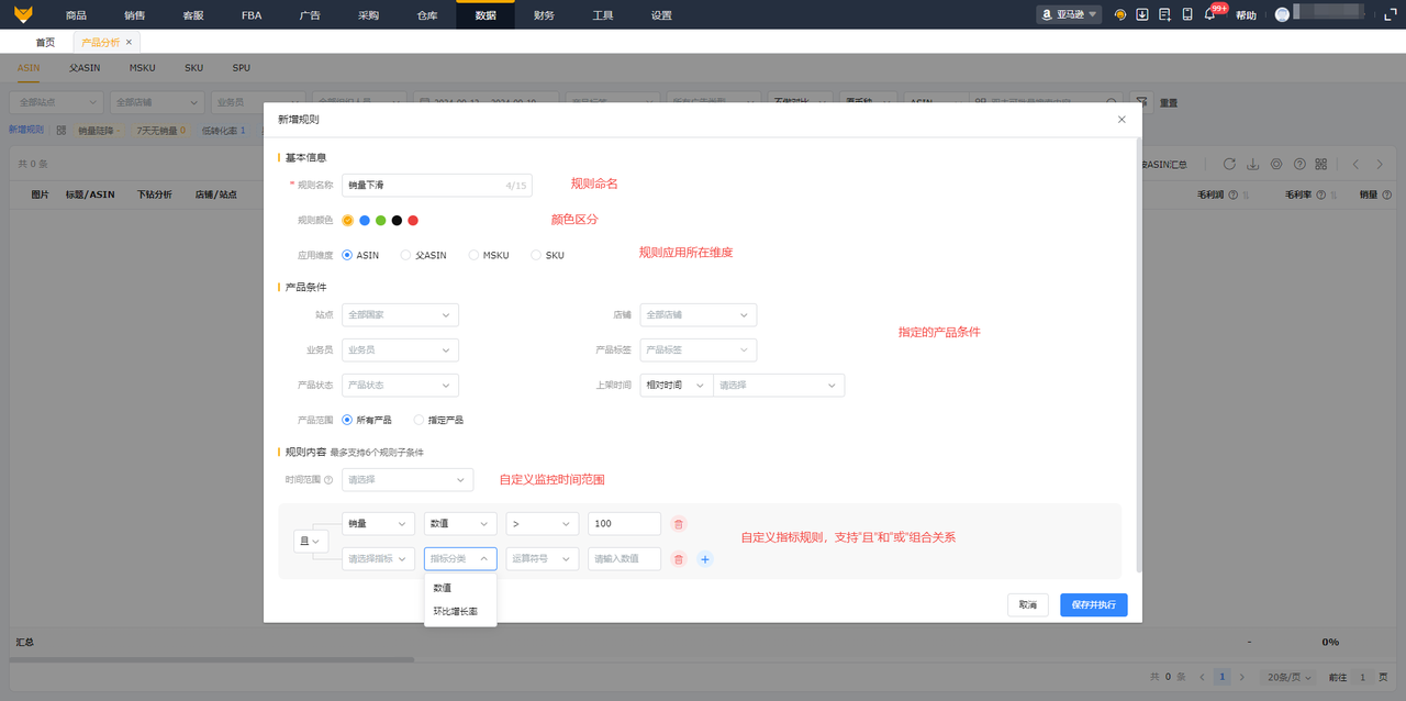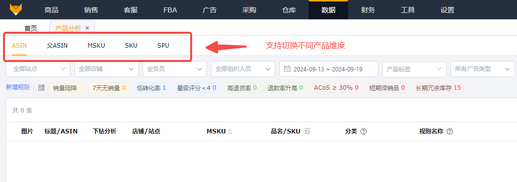 - 数据全:产品分析基于ASIN、父ASIN、MSKU和SKU等维度,多方位全方面的聚合了亚马逊平台所有业务场景数据,包含销售、广告、库存、售后、流量、利润等数据,可全面了解产品表现情况,为商品分析、运营决策、广告调整等诉求提供判断依据,为决策支撑;