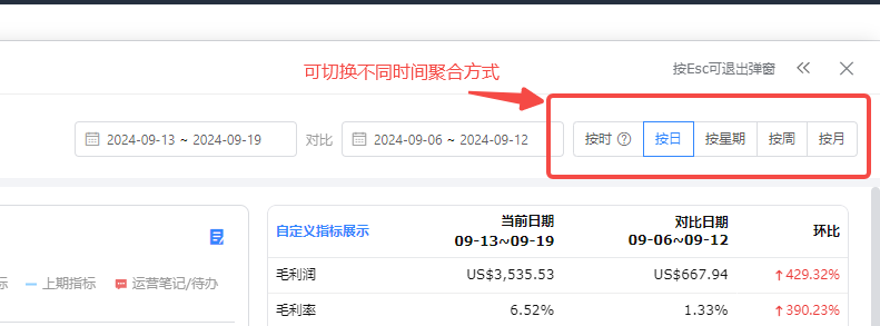 - 【按周】即所选时间段,每个自然周的数据,帮助我们从周的维度,分析商品的周表现;