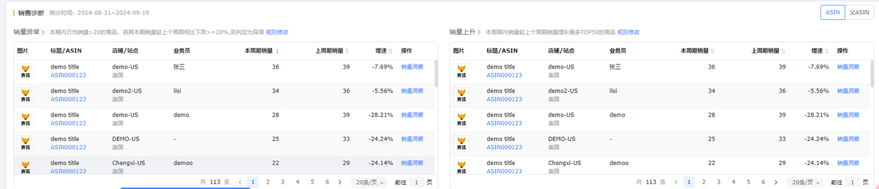 经营看板一打开,我们会直接告诉用户哪些产品有经营问题,并且我们会通过矩阵分析告诉用户,哪些商品要加预算,哪些商品要做高转化?1.销售诊断帮助发现热销品,增长强势的商品,以及销量出现大幅下滑的产品。此外我们支持规则修改,可以支持用户通过设置查看连续不出单的产品以及查看增速快和增长快的头部产品