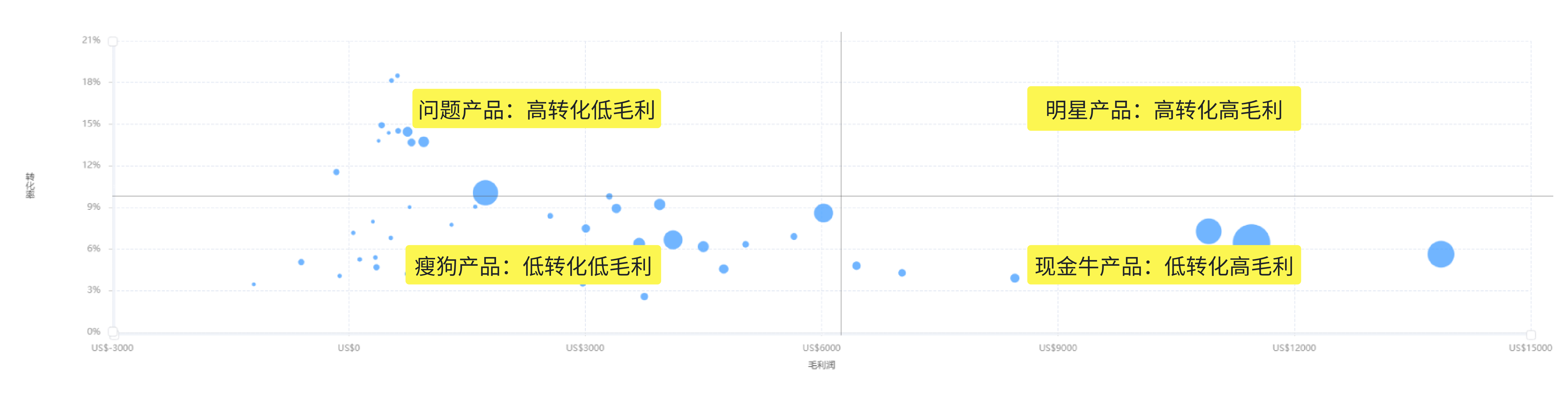 2.通过对毛利润和转化率的交叉分析,从四象限图中,我们可以明显的发现机会点