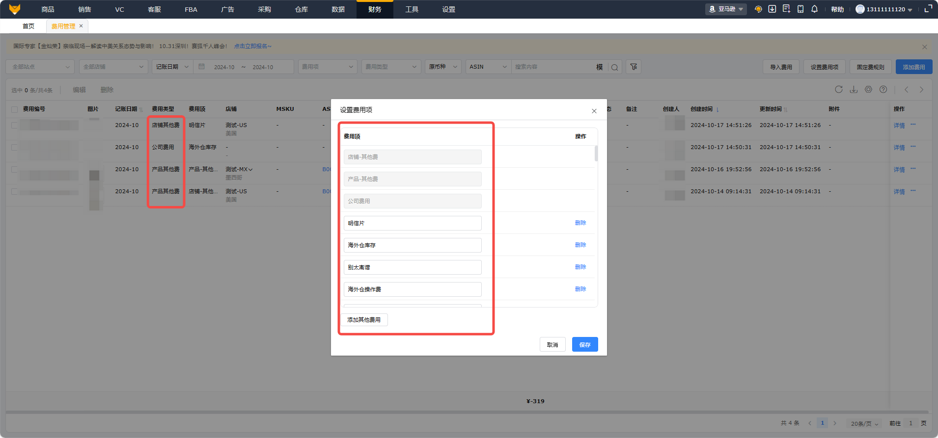 - 赛狐【财务】-【费用管理】功能,支持卖家自行定义站外费用的费用类型,选择对应类型添加费用,并支持查询历史所有的费用明细;