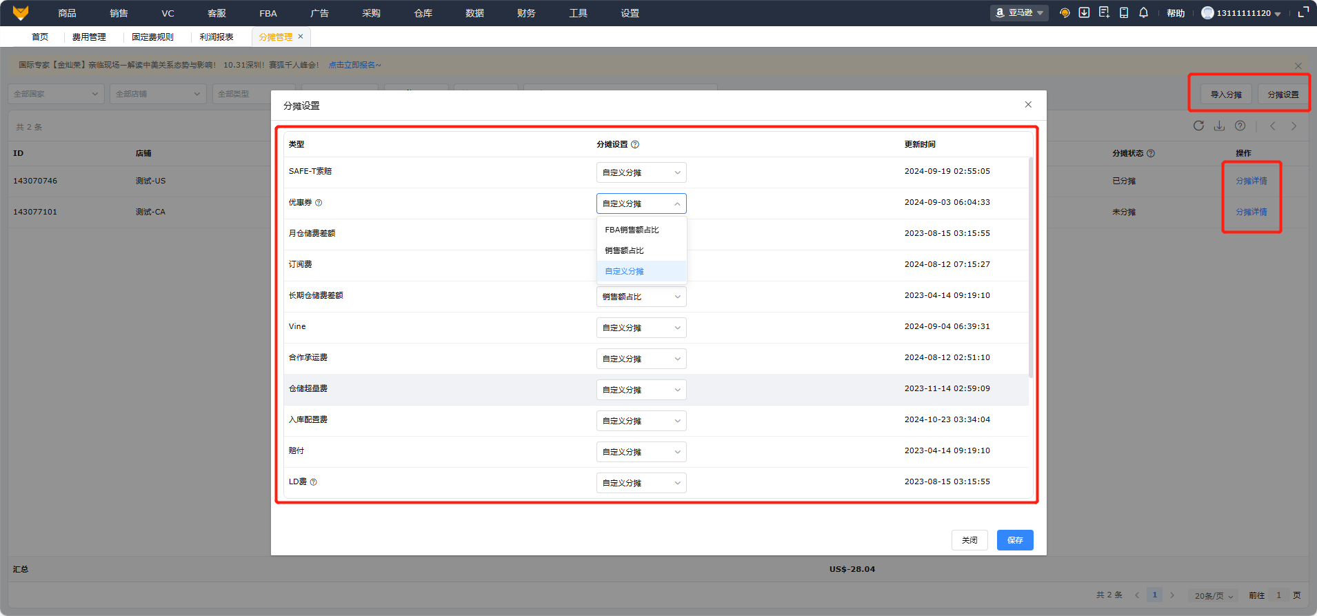 - 店铺维度的站外费用,支持按销售额/销量/均摊等多种分摊方式到MSKU维度,实时推动到财务报表,实现利润准确核算;