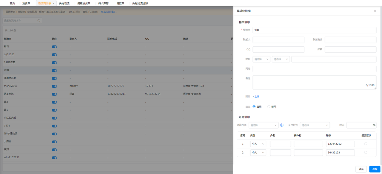 - 物流商管理:赛狐ERP提供了一个集中的物流商管理平台,用户可以在这里维护所有物流商的资料,包括账户信息、结算方式等,提高管理效率。